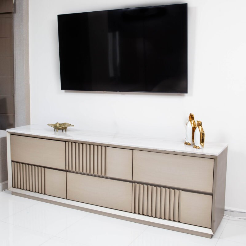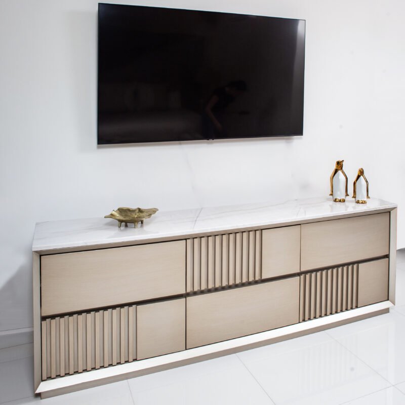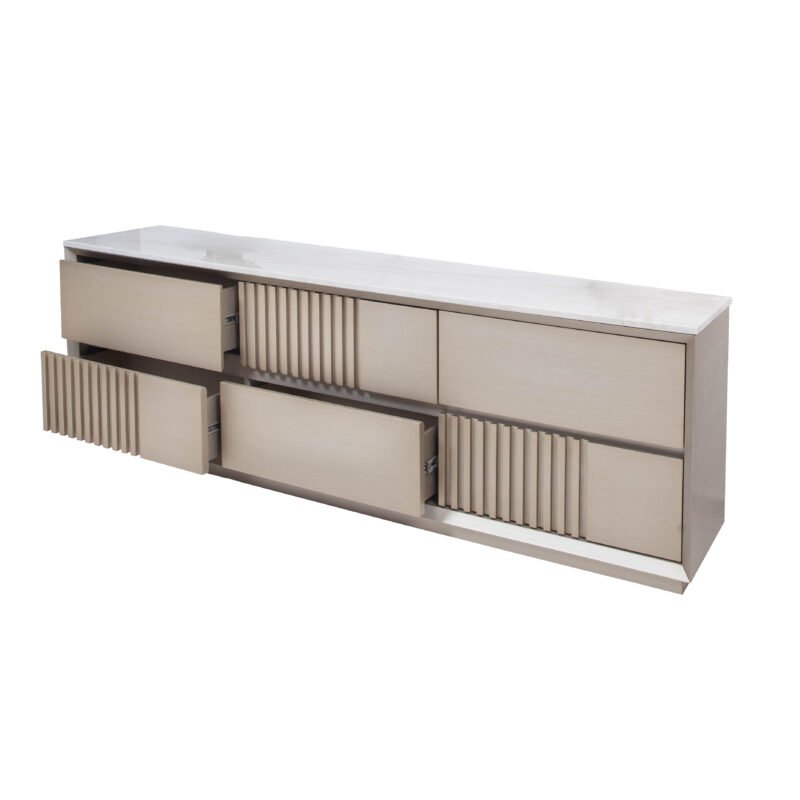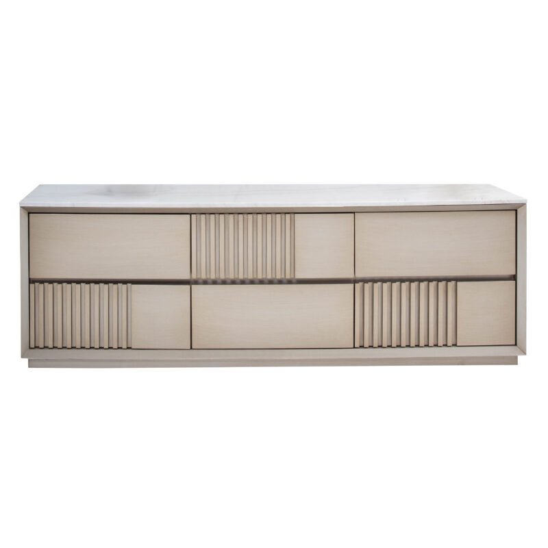 Cómoda de 6 cajones fabricada en madera sólida de okume, acabado en tono champagne con cubierta de piedra.